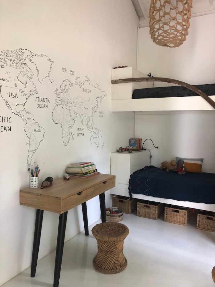 Another impression of the courtyard below. On the right, Guido’s bedroom. His bunkbed was made out of branches we collected after a storm in the garden and his desk is tailor made by locals in our community.